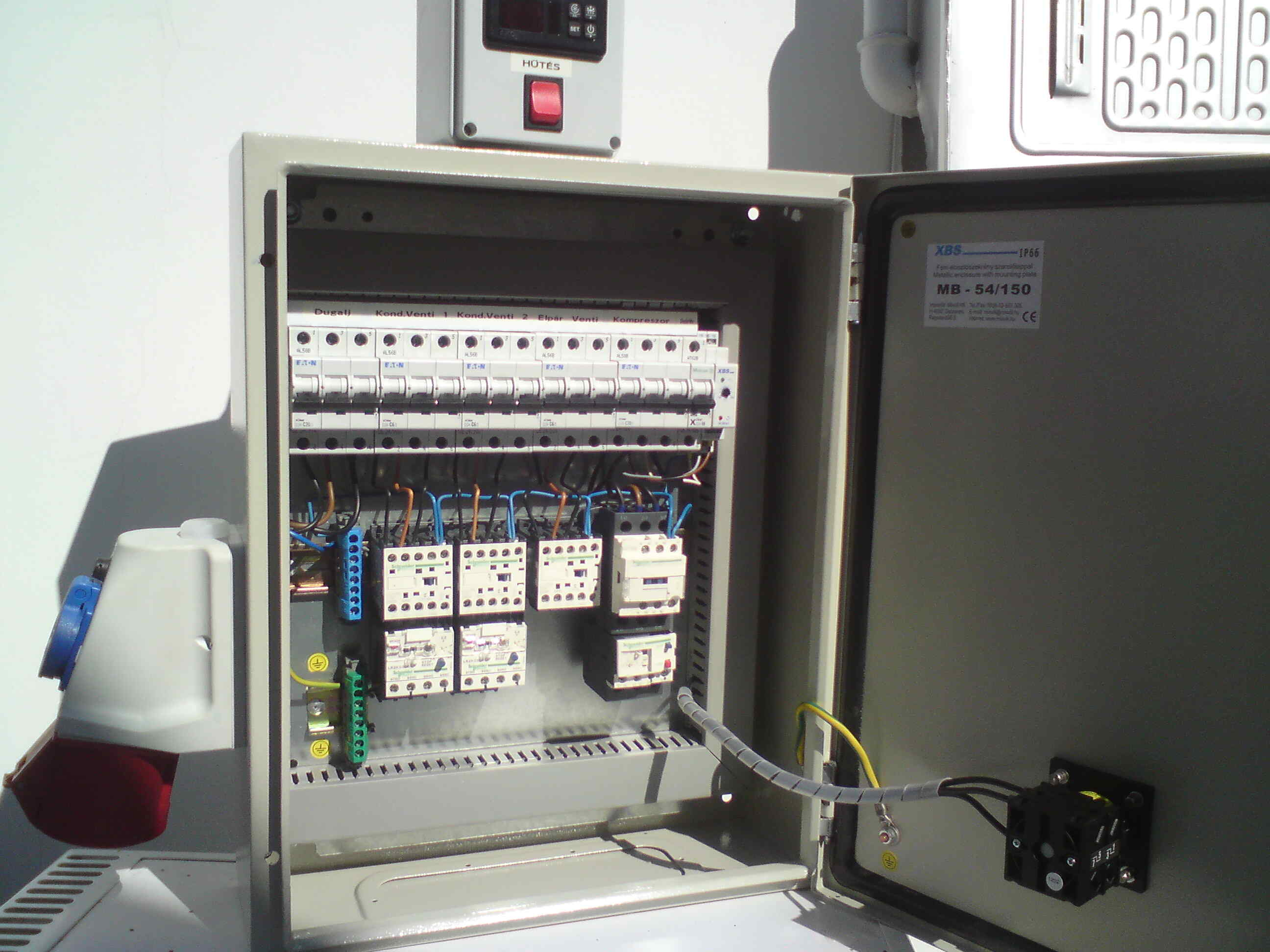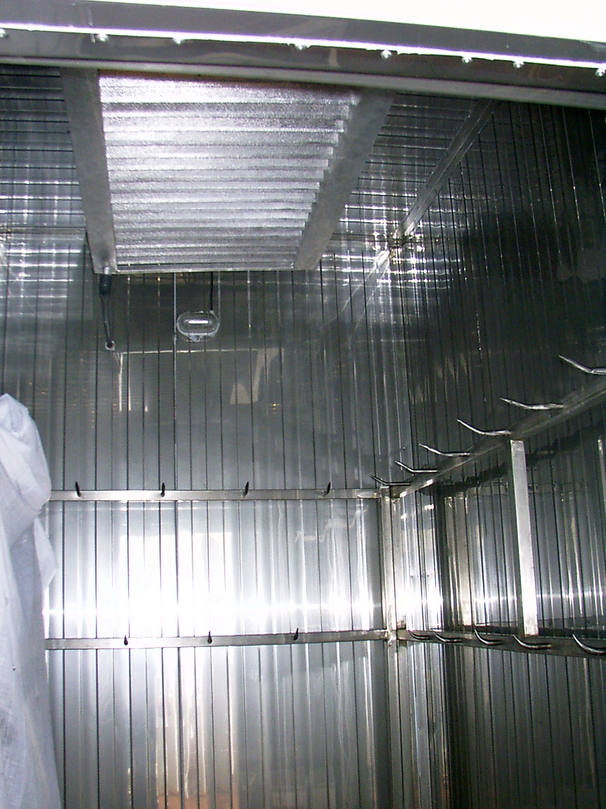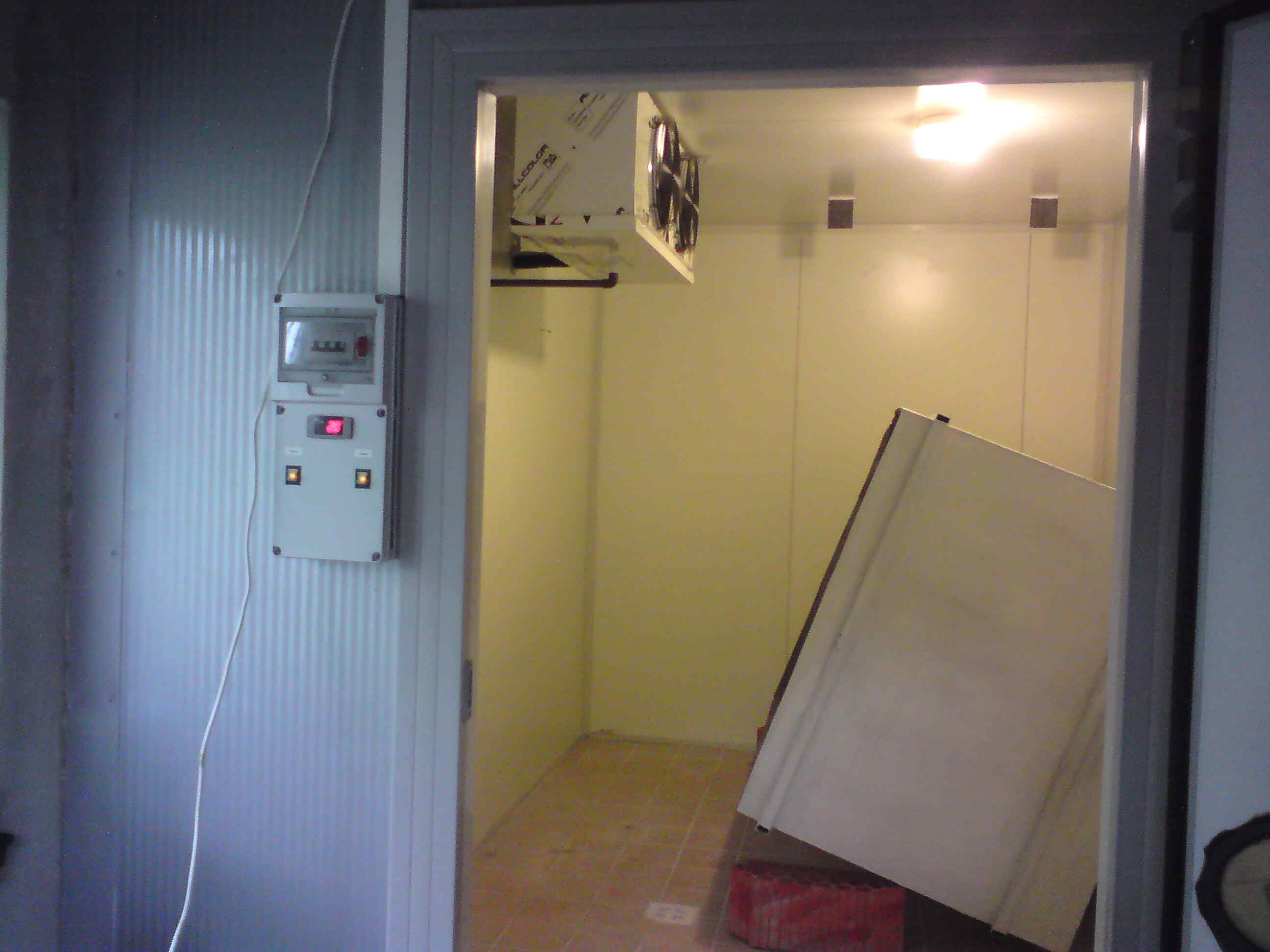 A panelezés 10cm vastagságban, rozsdamentes belsővel lett telepítve, így megfelelt a legszigorúbb egészségügyi előírásoknak és a H.C.C.P. - minőségi rendszernek is. A hűtőkamra ajtó szintén rozsda mentes, masszív 3 pontos zsanérú, így több ezer nyitásnak, erős igénybevételnek is ellen áll. További előnye, hogy zárható, illteve a belső nyitó gomb foszforeszkál, így látható sötétben. Továbbá belülről mindig kinyitható, biztonsági okok miatt. A hűtőtest statikus kivitelű (ventilátor nélküli) , hogy ne szárítsa (barnítsa be) a friss húst idő előtt. Szintén rozsda mentes, az előírások megfelelése érdekében. A gépészet távolabb (8m) lett telepítve, hogy ne zavarja az eladó teret, dolgozókat. Jó látható helyen lett elhelyezve a digitális vezérlő, hogy az aktuális hőmérsékletet tizedes pontossággal nyomon lehessen követni, illetve egyéb funkciókat, mint például az olvasztási ciklusokat.