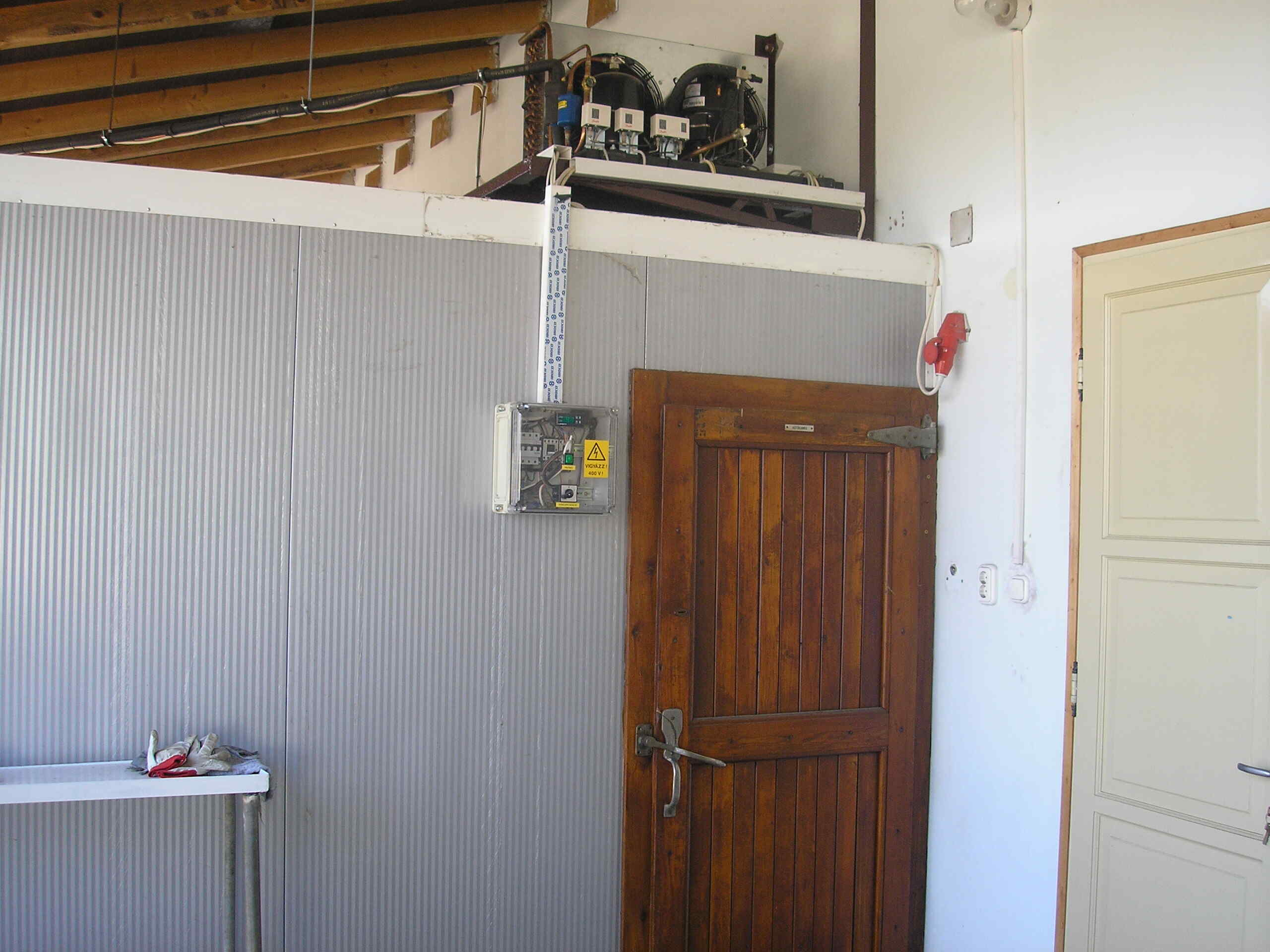 Megbízónk kőművessel alakított ki egy helységet a meglévő melléképületi sorból. Mi a szendvics panelből alakítottuk ki a hűtött teret. Előre bent hagyva egy tartályt, ami a technológiához kellett. A gépészet 400V üzemű, teljesen automata, csak a kívánt hőfokot kell beállítani.